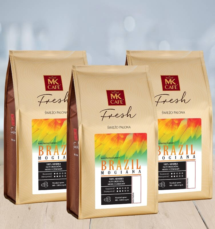 Zestaw tworzą trzy opakowania kawy ziarnistej MK Fresh Brazil Mogiana 1kg.